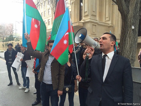 Trend-in məlumatına görə, aksiya iştirakçıları Ə.Kərimlinin sosial şəbəkədə qeyd etdiyi antiazərbaycan fikirlərinə etirazlarını ifadə edərək müxtəlif şüarlar səsləndiriblər.