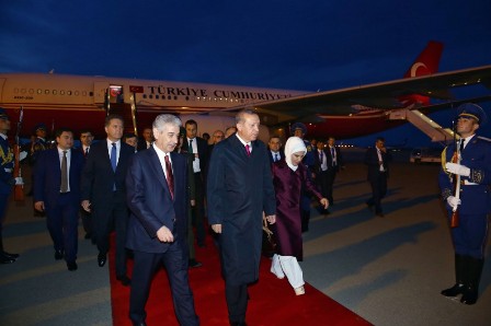 R.T.Ərdoğanı və xanımı Əminə Ərdoğanı hava limanında Azərbaycanın Baş nazirinin müavini Əli Əhmədov və digər rəsmi şəxslər qarşılayıblar.