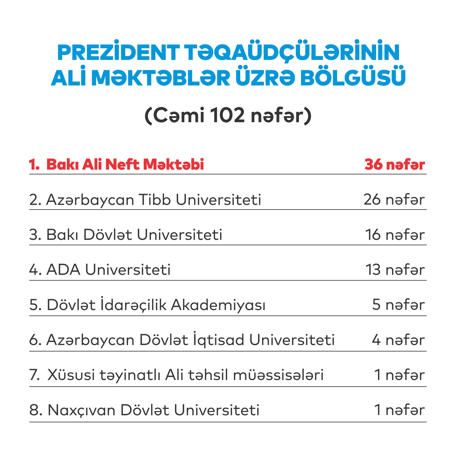 BANM artıq 6-cı ildir ki, Prezident təqaüdçülərinin sayına görə liderdir. Təqaüdçülərin üçdə birindən çoxunu BANM tələbələri təşkil edir.