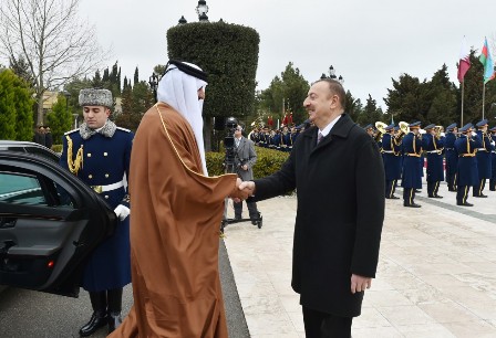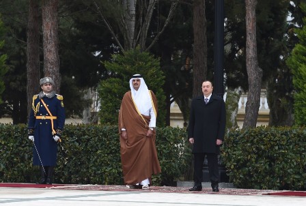 Hər iki ölkənin dövlət bayraqlarının dalğalandığı meydanda Qətər Dövlətinin Əmirinin şərəfinə fəxri qarovul dəstəsi düzülüb.