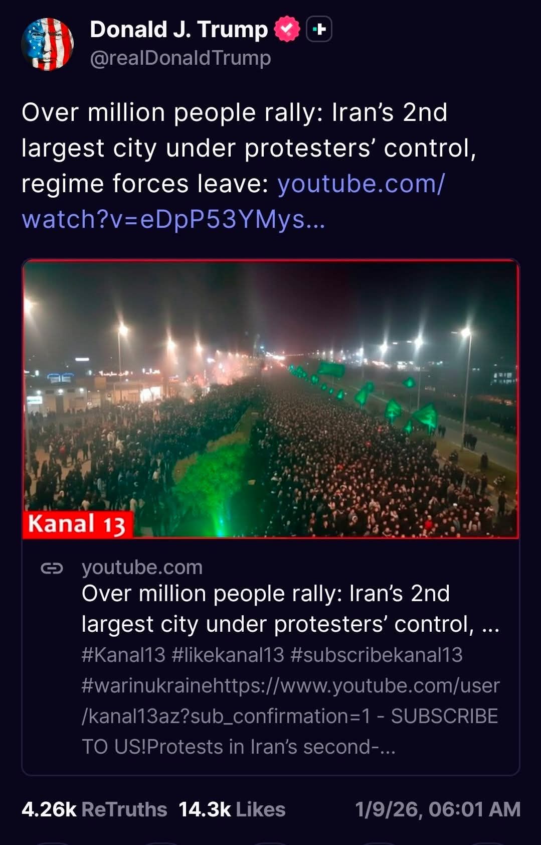 US President Donald Trump shared a video from Azerbaijan's Kanal 13 YouTube channel regarding the protests in Iran on his Truth Social social media account.