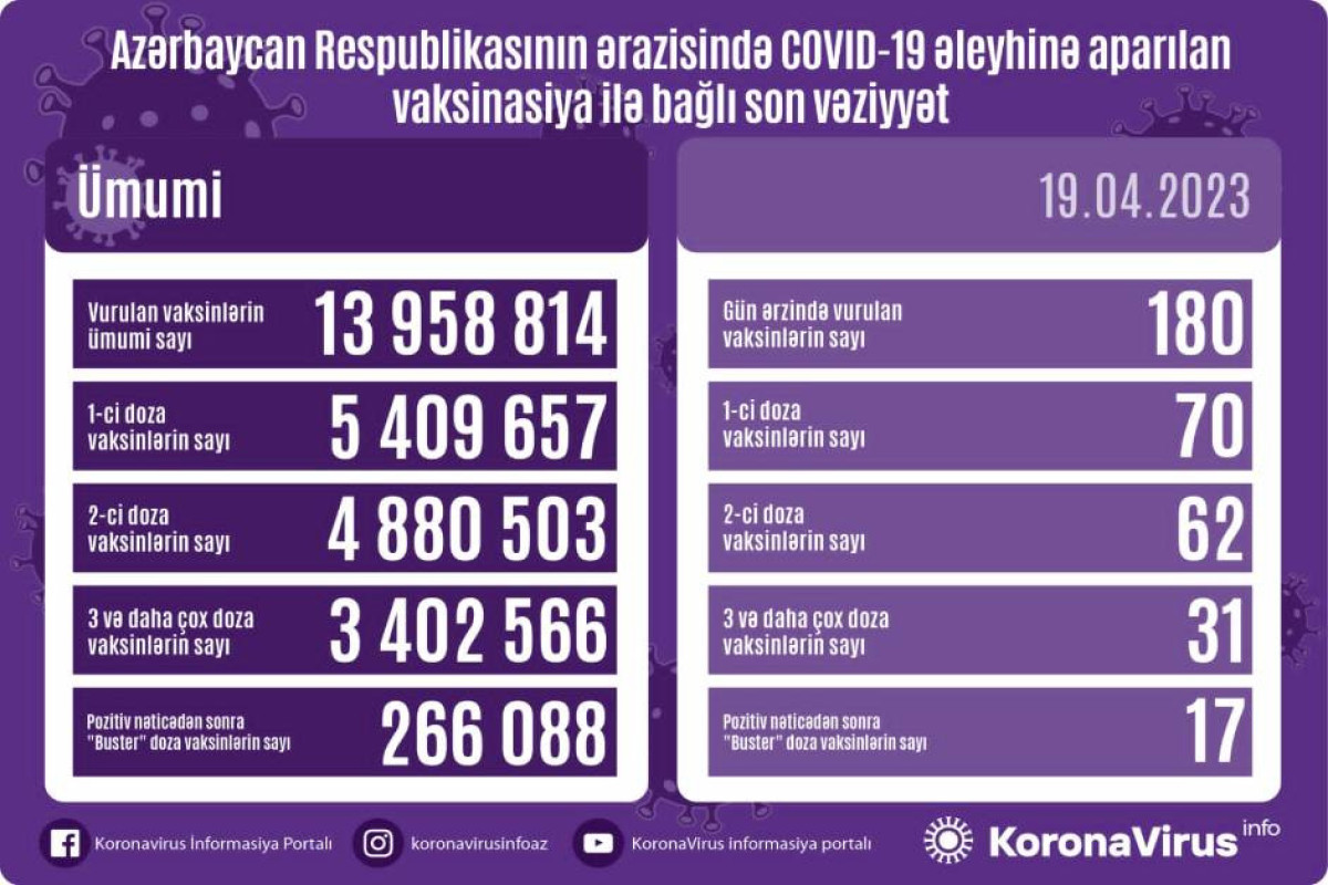 Vurulan vaksinlərin ümumi sayı 13 958 814, birinci mərhələ üzrə vaksinasiya olunanların ümumi sayı 5 409 657, ikinci mərhələ üzrə vaksinasiya olunanların sayı 4 880 503, üç və daha çox doza üzrə vaksinasiya olunanların sayı 3 402 566, pozitiv nəticədən sonra buster doza üzrə vaksinasiya olunanların sayı isə 266 088 nəfər təşkil edir.