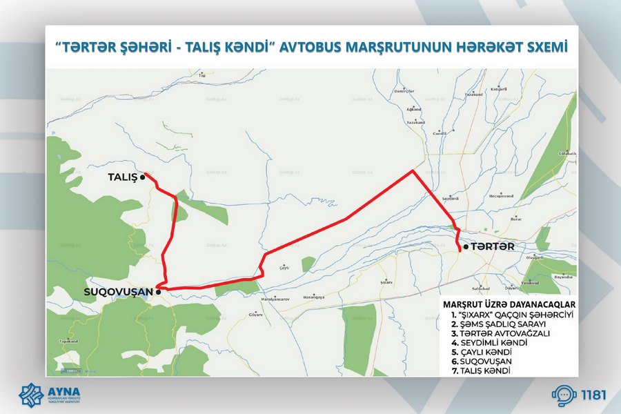 İlk mərhələdə marşrut “Şıxarx” qaçqın şəhərciyindən başlamaqla Talış kəndi istiqamətində Tərtər şəhərinin mərkəzi bazarı, Avtovağzal, Seydimli, Çaylı və Suqovuşan kəndləri aralıq dayanacaqlarından keçməklə təşkil olunub. Hazırda sərnişinlərə bir kiçik tutumlu nəqliyyat vasitəsilə xidmət göstərilir və gün ərzində 2 reys həyata keçirilir.