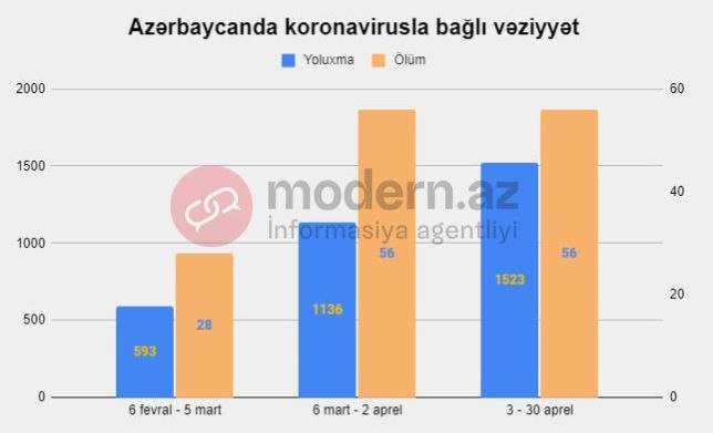 Modern.az Azərbaycanda koronavirusla bağlı vəziyyəti statistik göstəricilər əsasında təhlil edib. Belə ki, analoji dövrdə, yəni 3-30 aprel tarixlərində Azərbaycanda 1523 nəfər koronavirusa yoluxub, 56 nəfər vəfat edib. Yoluxanların sayı əvvəlki 28 günlə müqayisədə 30%-dən çox artıb, ölüm sayı isə dəyişməyib.