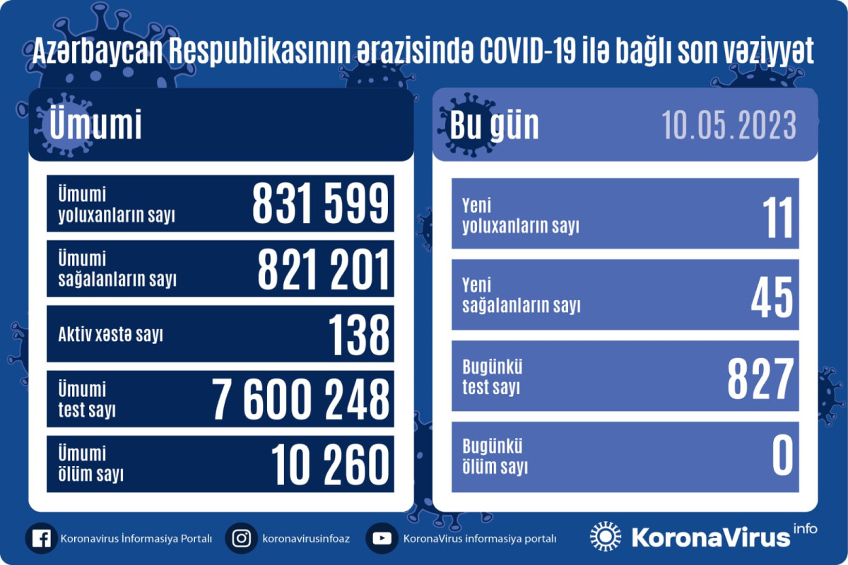 Azərbaycanda koronavirus (COVID-19) infeksiyasına 11 yeni yoluxma faktı qeydə alınıb, 45 nəfər müalicə olunaraq sağalıb.