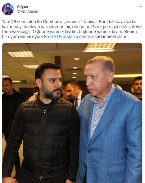 Müğənni Alişan isə Ərdoğana dəstəyini ifadə edib: "Prezidentimizi tanımağımdan 26 il keçdi. Mən heç vaxt qalib gəlmək üçün son dəqiqəyə qədər gözləyib yazanlardan olmamışam. Bazar günü daha bir qələbə ilə tarix yazacağıq. O gün sizinlə idim və bu gün də yanınızdayam. Bir səsim var və o da cənab Ərdoğana... Sona qədər uğurlar"