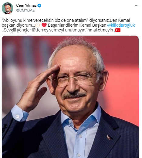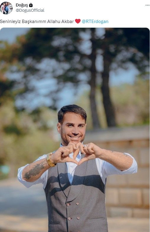 Müğənni Doğuş isə Ərdoğanın prezident seçilməsini istəyir. "Səninləyik, prezidentim, Allahu Əkbər" yazan ifaçı Rəcəb Tayyib Ərdoğanın tvitter hesabını işarələyib.