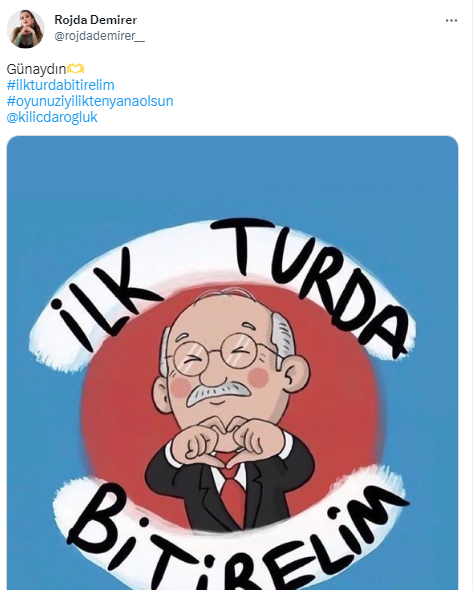 Aktrisa Rojda Demirer sosial media hesabında "Millət İttifaqı"nın prezidentliyə namizədi Kamal Kılıçdaroğlunu dəstəklədiyini yazıb.