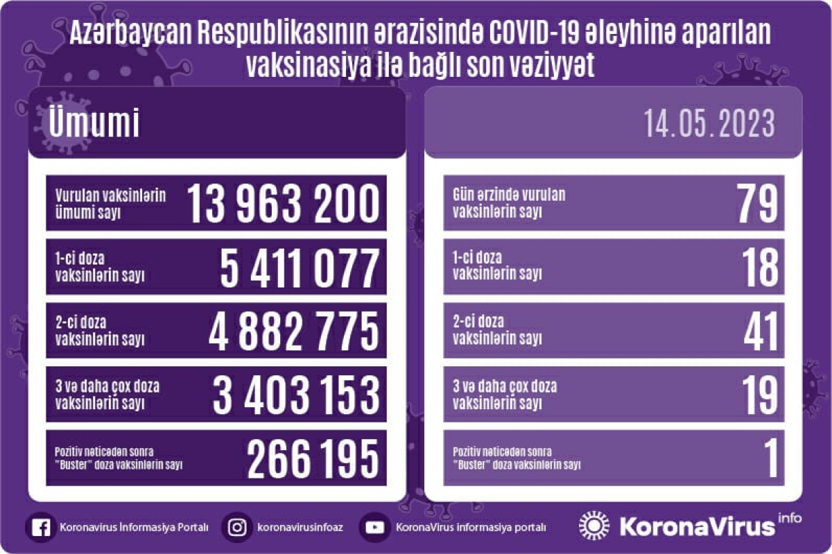 Ölkədə vurulan vaksinlərin ümumi sayı 13 963 200, birinci mərhələ üzrə vaksinasiya olunanların ümumi sayı 5 411 077, ikinci mərhələ üzrə vaksinasiya olunanların sayı 4 882 775, 3-cü və daha çox doza üzrə vaksinasiya olunanların sayı 3 403 153, pozitiv nəticədən sonra buster doza olunanların sayı 266 195 təşkil edir.