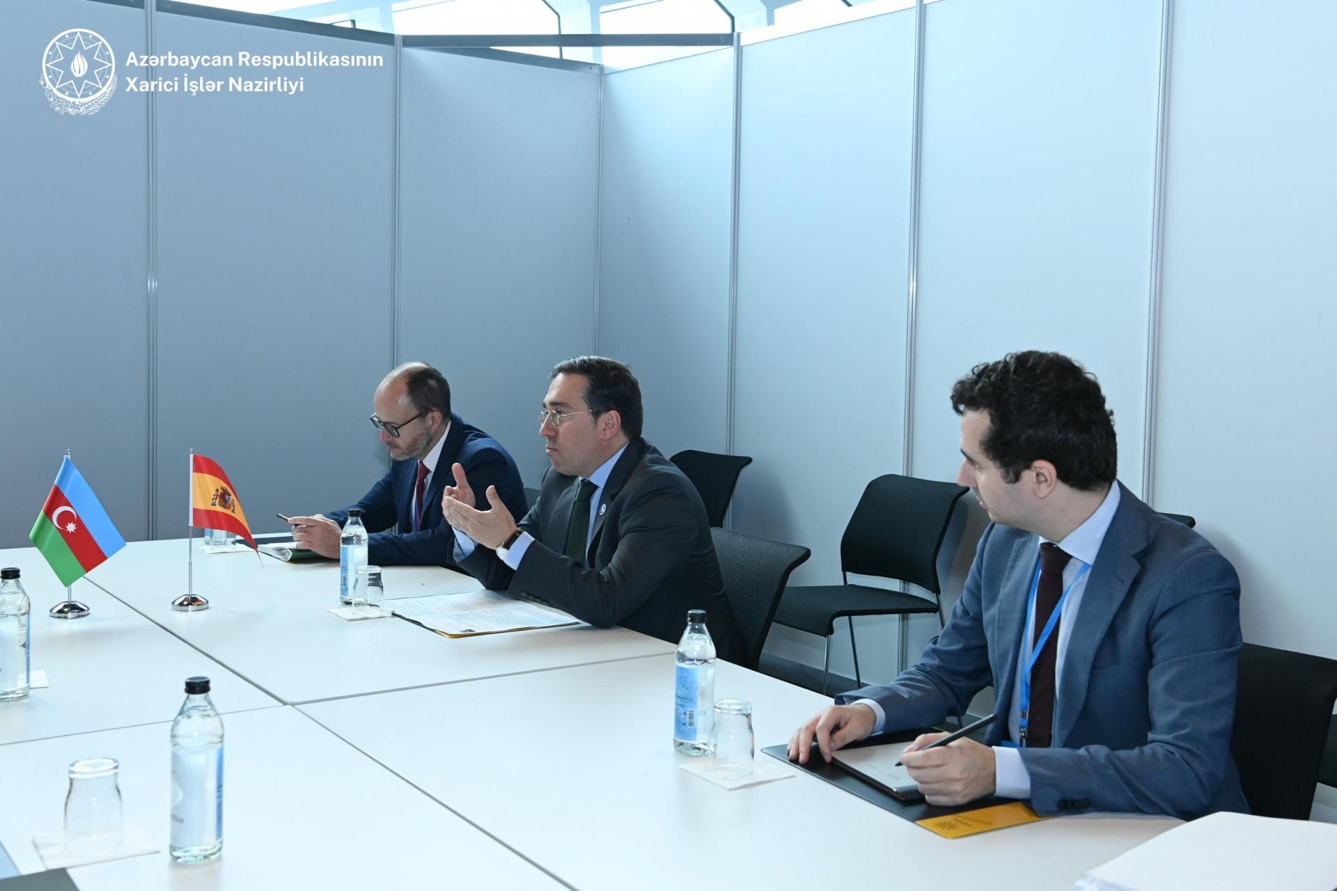 Nazir Xose Manuel Albares Bueno, Azərbaycanla həm ikitərəfli səviyyədə, həm də beynəlxalq təşkilatlar çərçivəsində əməkdaşlıqda maraqlı olduqlarını bildirib. Bu xüsusda, iki ölkə arasında münasibətlərin inkişafında keçirilmiş siyasi məsləhətləşmələrin rolu müsbət qiymətləndirilib. Nazir Xose Manuel Albares Bueno İspaniyanın Azərbaycan və Ermənistan arasında münasibətlərin normallaşması istiqamətində danışıqlar prosesini dəstəklədiyini qeyd edib.