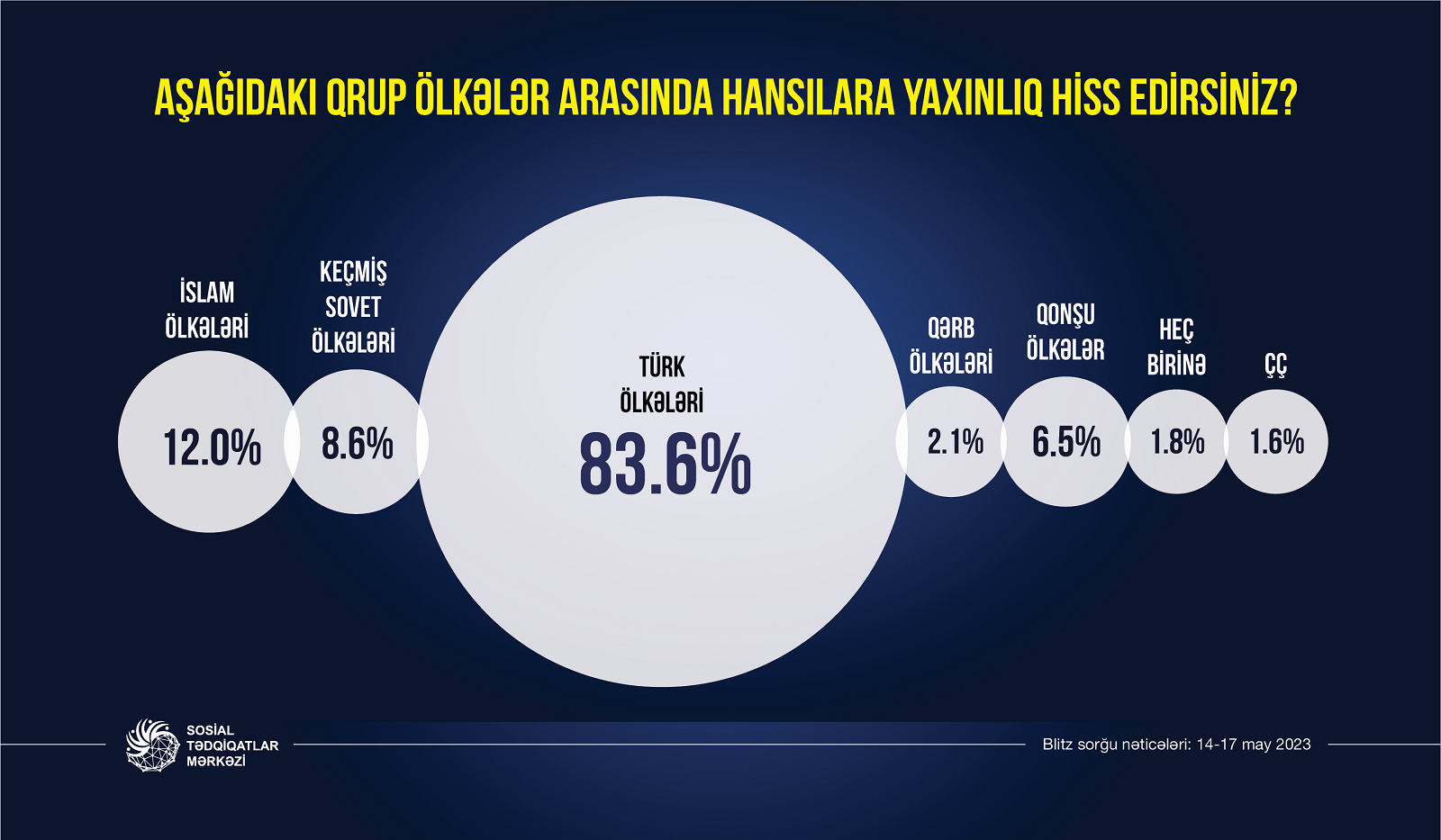Sosial Tədqiqatlar Mərkəzi rəy sorğusu əsasında vətəndaşların hansı qrup ölkələri özlərinə yaxın hiss etmələri ilə bağlı fikirlərini öyrənib. Bu məqsədlə onlara “Aşağıdakı qrup ölkələr arasında hansılara yaxınlıq hiss edirsiniz?” sualı ünvanlanıb və bir neçə cavab variantı seçmək imkanı verilib.