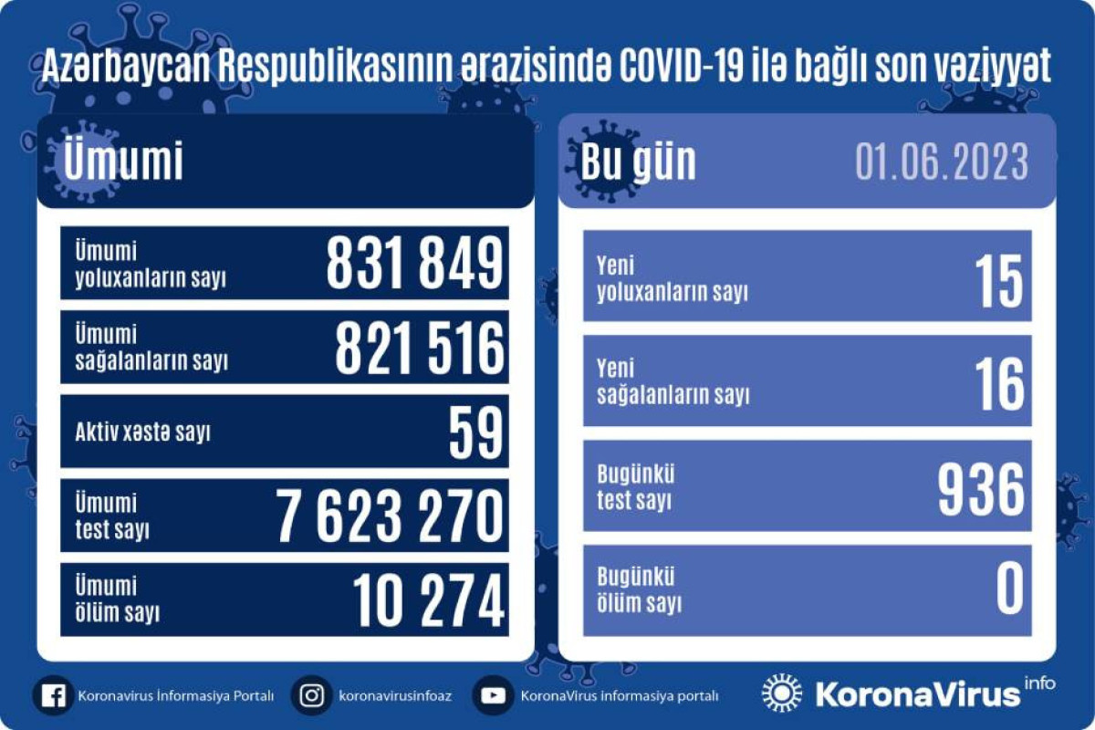 Azərbaycanda indiyədək ümumilikdə 831 849 nəfər koronavirus infeksiyasına yoluxub. Onlardan 821 516 nəfər müalicə olunaraq sağalıb, 10 274 nəfər vəfat edib, aktiv xəstə sayı 59 nəfərdir.