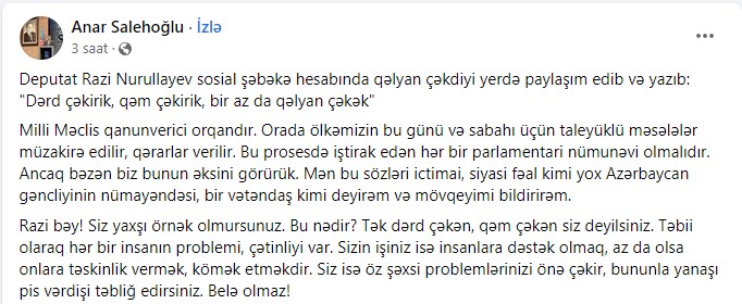 Milli Məclisin deputatı, Milli Cəbhə Partiyasının sədri Razi Nurallayevin feysbuk paylaşımı birmənalı qarşılanmayıb.