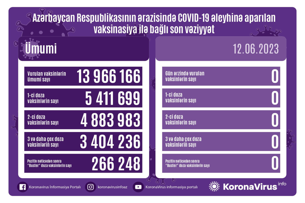 Vurulan vaksinlərin ümumi sayı 13 966 166, birinci mərhələ üzrə vaksinasiya olunanların ümumi sayı 5 411 699, ikinci mərhələ üzrə vaksinasiya olunanların sayı 4 883 983, üç və daha çox doza üzrə vaksinasiya olunanların sayı 3 404 236, pozitiv nəticədən sonra buster doza üzrə vaksinasiya olunanların sayı isə 266 248 nəfər təşkil edir.