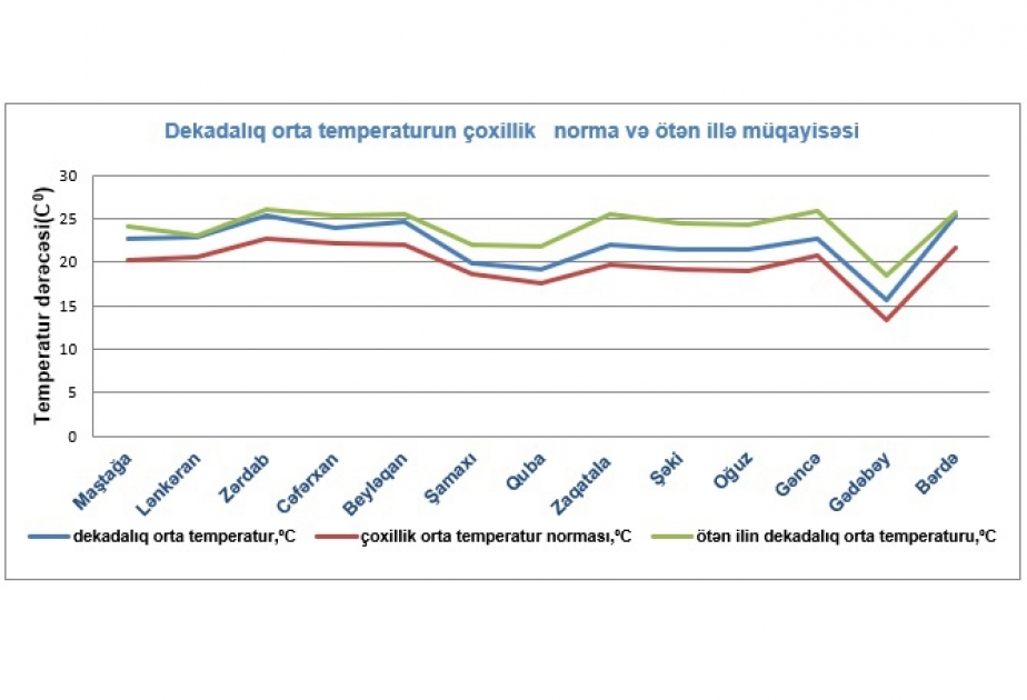 Ekologiya və Təbii Sərvətlər Nazirliyinin Milli Hidrometeorologiya Xidmətindən Modern.az-a verilən məlumata görə, havanın dekadalıq orta temperaturu paytaxt üzrə Maştağada, Naxçıvanda, Lənkəranda, Ceyrançöldə və Tovuzda 22-23º, Qarabağ bölgəsində, Mil-Muğan və Mərkəzi Aranda 24-25º, Şəki-Zaqatalada 21-23º, Gədəbəydə 16º, Qubada 19º, Dağlıq Şirvan bölgəsində 20-21º, Gəncədə və Goranboyda 23-25º qeydə alınıb.