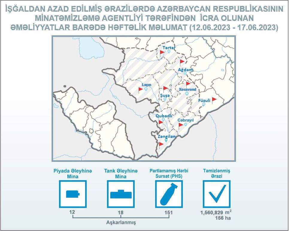 ANAMA-dan Modern.az-a verilən məlumata görə, 12-17 iyun tarixlərində Tərtər, Ağdam, Xocavənd, Laçın, Füzuli, Şuşa, Qubadlı, Cəbrayıl və Zəngilanda aparılan minatəmizləmə əməliyyatları zamanı piyada əleyhinə 12, tank əleyhinə 18 mina və 151 partlamamış hərbi sursat aşkarlanaraq zərərsizləşdirilib.