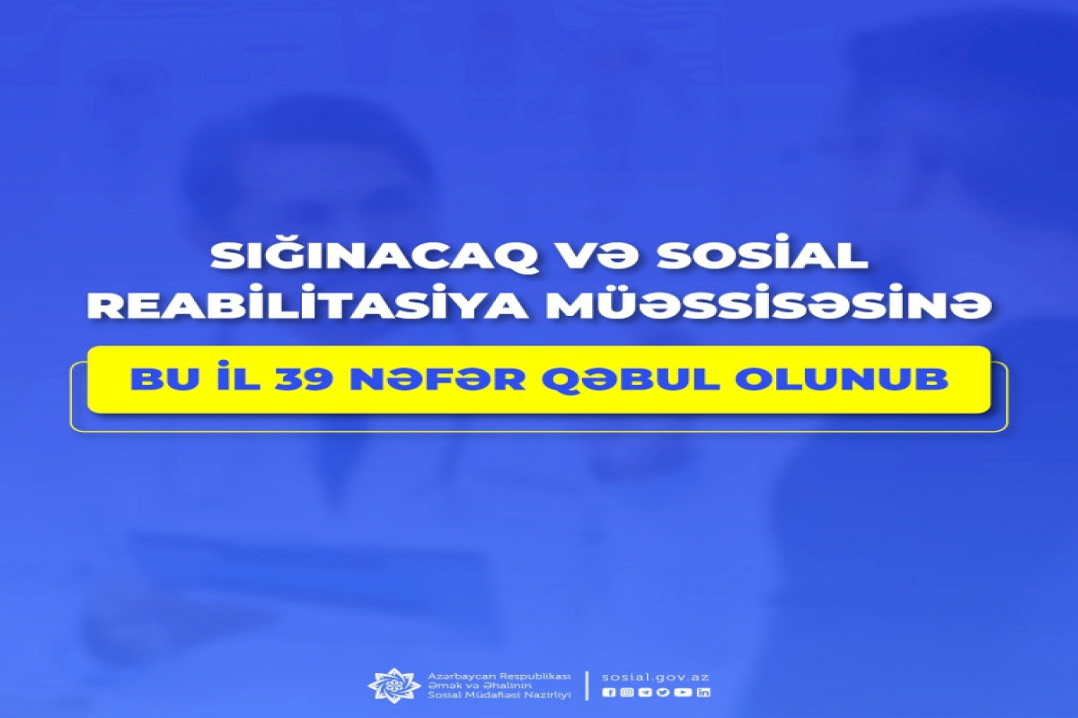 Əmək və Əhalinin Sosial Müdafiəsi Nazirliyinin tabeliyindəki Sosial Xidmətlər Agentliyinin Həssas əhali qruplarından olan şəxslər üçün Sığınacaq və Sosial Reabilitasiya Müəssisəsinə bu il 39 nəfər qəbul olunub.