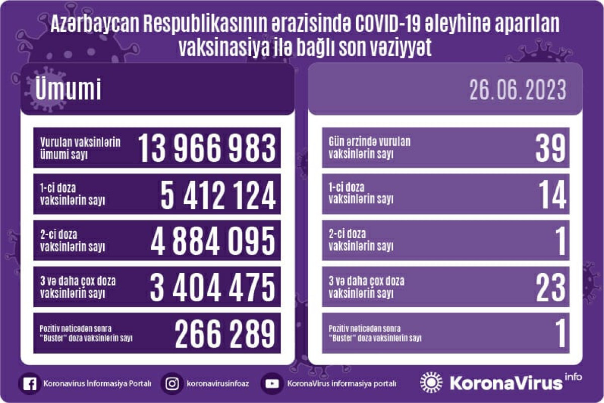 Ölkədə vurulan vaksinlərin ümumi sayı 13 966 983, birinci mərhələ üzrə vaksinasiya olunanların ümumi sayı 5 412 124, ikinci mərhələ üzrə vaksinasiya olunanların sayı 4 884 095, üç və daha çox doza vaksin vurduranların sayı 3 404 475, pozitiv nəticədən sonra buster doza üzrə vaksinasiya olunanların sayı isə 266 289 təşkil edir.