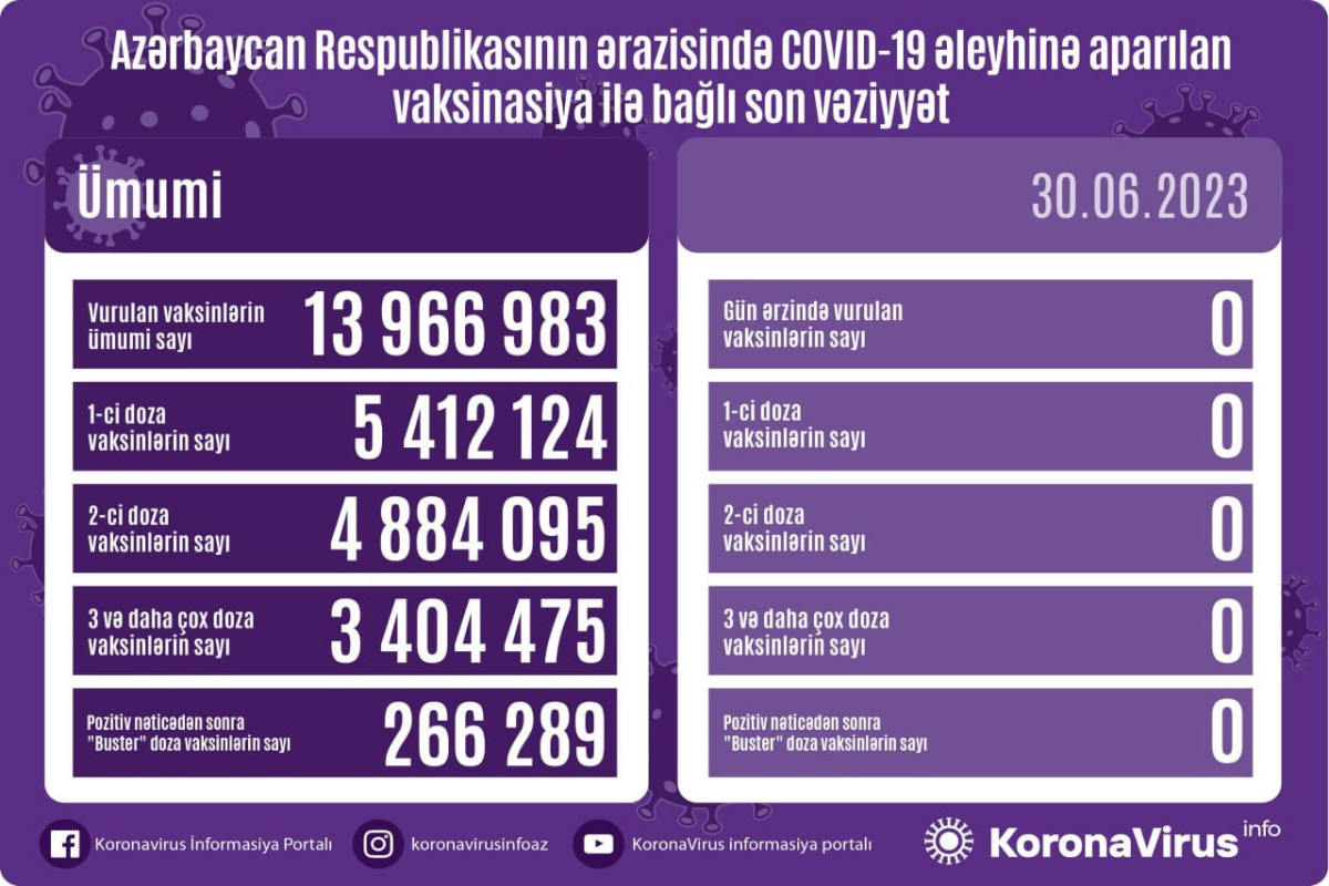 Ölkədə vurulan vaksinlərin ümumi sayı 13 966 983, birinci mərhələ üzrə vaksinasiya olunanların ümumi sayı 5 412 124, ikinci mərhələ üzrə vaksinasiya olunanların sayı 4 884 095, 3-cü və daha çox doza üzrə vaksinasiya olunanların sayı 3 404 475, pozitiv nəticədən sonra buster doza olunanların sayı 266 289 təşkil edir.