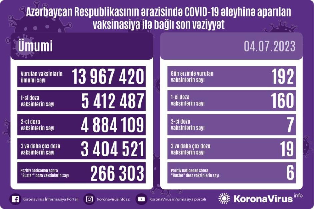 Ölkədə vurulan vaksinlərin ümumi sayı 13 967 420, birinci mərhələ üzrə vaksinasiya olunanların ümumi sayı 5 412 487, ikinci mərhələ üzrə vaksinasiya olunanların sayı 4 884 109, üç və daha çox doza vaksin vurduranların sayı 3 404 521, pozitiv nəticədən sonra buster doza üzrə vaksinasiya olunanların sayı isə 266 303 təşkil edir.