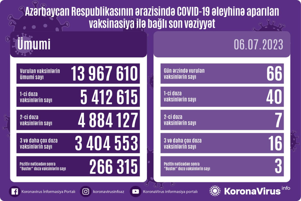 Ölkədə vurulan vaksinlərin ümumi sayı 13 967 610, birinci mərhələ üzrə vaksinasiya olunanların ümumi sayı 5 412 615, ikinci mərhələ üzrə vaksinasiya olunanların sayı 4 884 127, üç və daha çox doza vaksin vurduranların sayı 3 404 553, pozitiv nəticədən sonra buster doza üzrə vaksinasiya olunanların sayı isə 266 315 təşkil edir.
