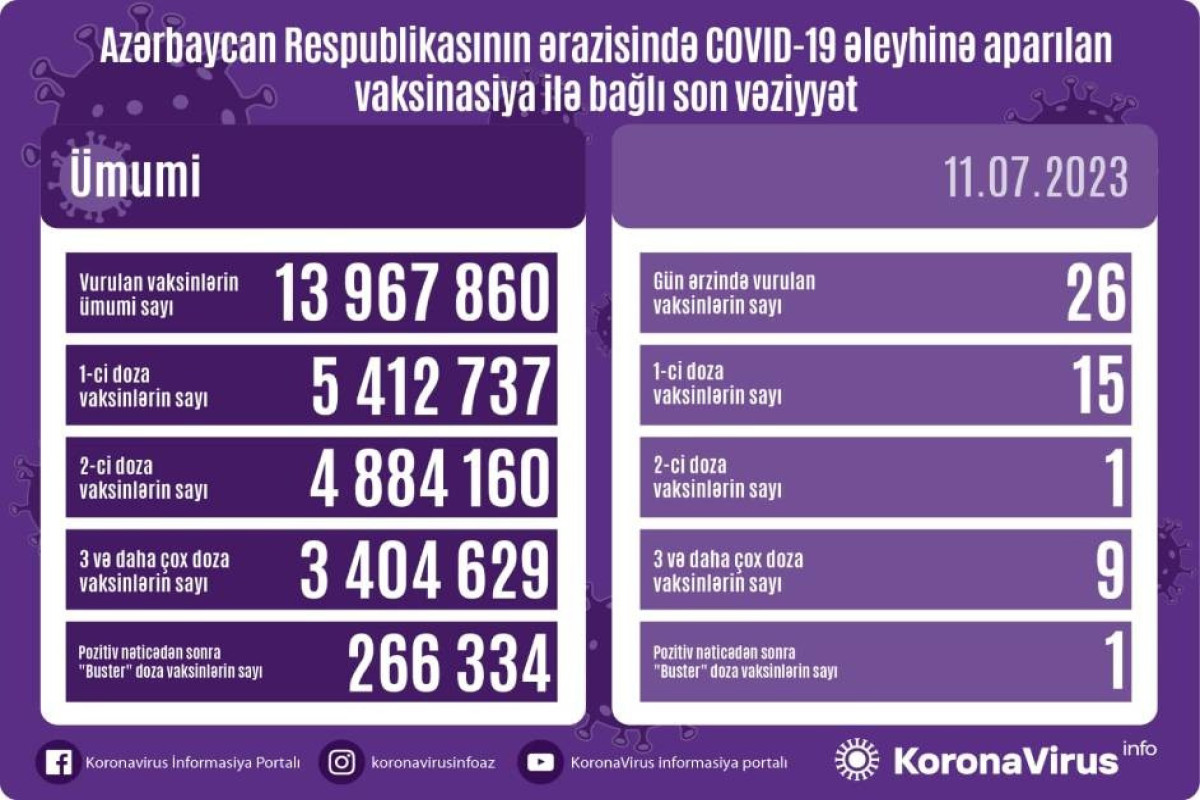 Vurulan vaksinlərin ümumi sayı 13 967 860, birinci mərhələ üzrə vaksinasiya olunanların ümumi sayı 5 412 737, ikinci mərhələ üzrə vaksinasiya olunanların sayı 4 884 160, üç və daha çox doza üzrə vaksinasiya olunanların sayı 3 404 629, pozitiv nəticədən sonra buster doza üzrə vaksinasiya olunanların sayı isə 266 334 nəfər təşkil edir.