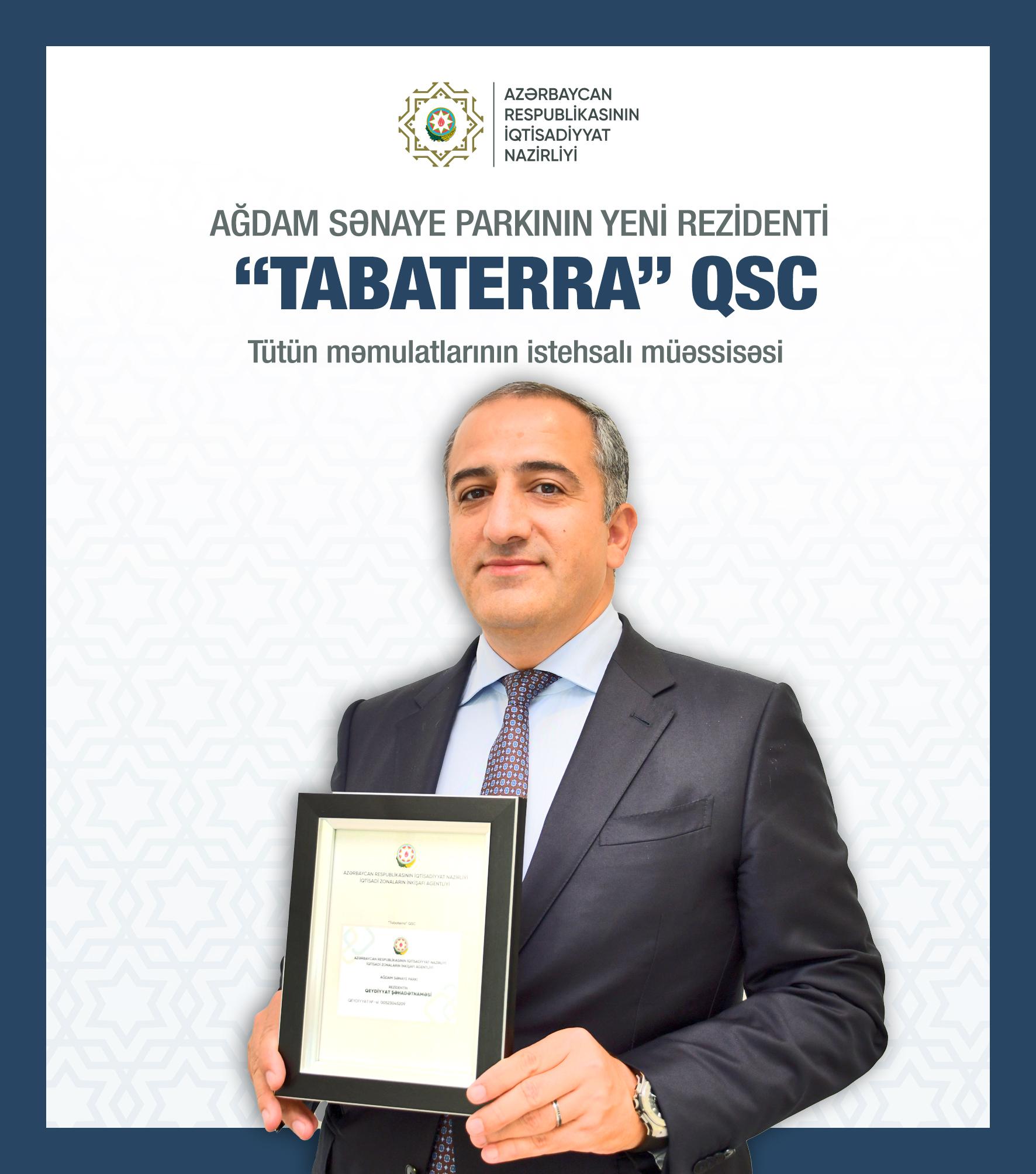 Azərbaycanda siqaret istehsalı ilə məşğul olan “Tabaterra” QSC-yə Ağdam Sənaye Parkının rezidenti statusu verilib.