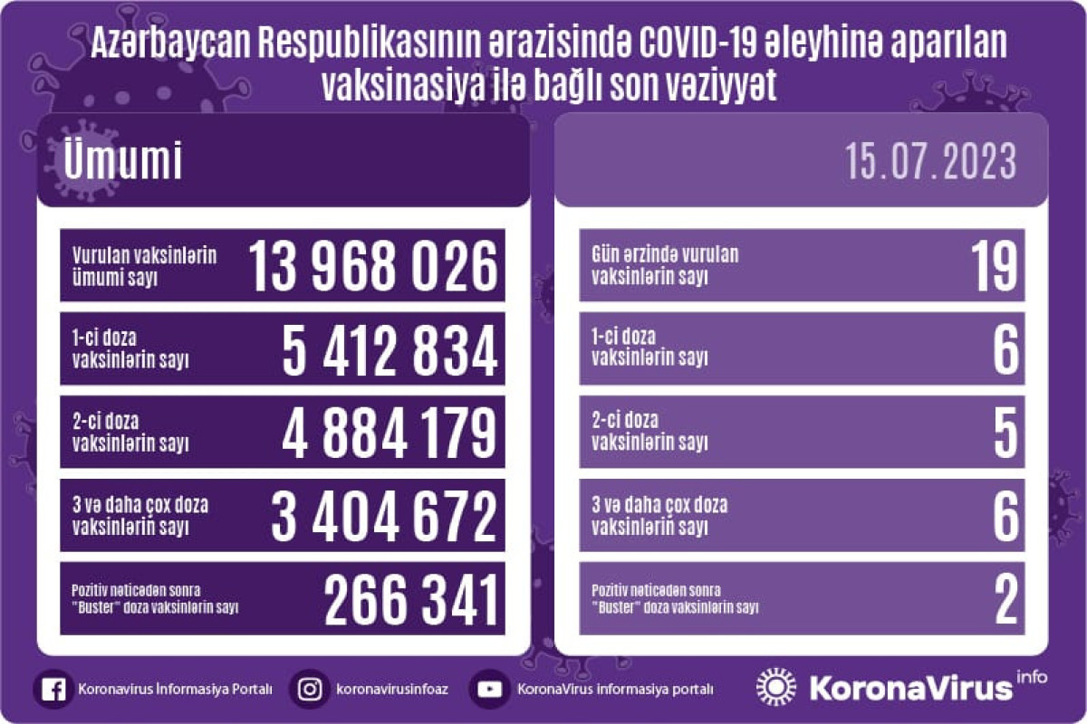 Ölkədə vurulan vaksinlərin ümumi sayı 13 968 026, birinci mərhələ üzrə vaksinasiya olunanların ümumi sayı 5 412 834, ikinci mərhələ üzrə vaksinasiya olunanların sayı 4 884 179, üç və daha çox doza vaksin vurduranların sayı 3 404 672, pozitiv nəticədən sonra buster doza üzrə vaksinasiya olunanların sayı isə 266 341 təşkil edir.