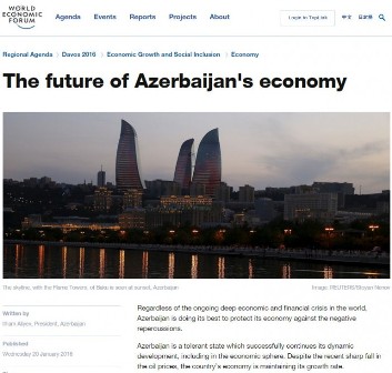 Davos İqtisadi Forumunun rəsmi saytında Azərbaycan Prezidenti İlham Əliyevin “Azərbaycan iqtisadiyyatının gələcəyi” mövzusunda məqaləsi yerləşdirilib.