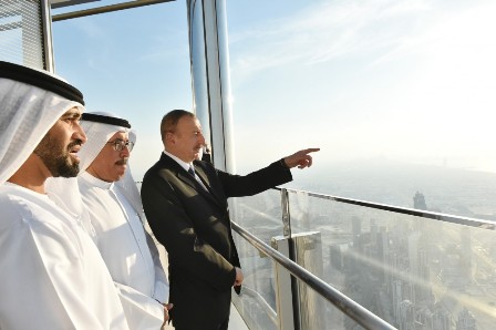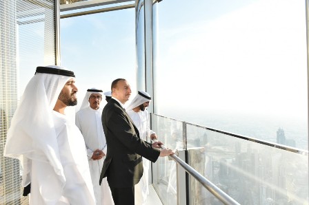 Dövlət başçısına məlumat verilib ki, dünyanın ən böyük göydələni olan “Bürc-Xəlifə”nin tikintisi 2004-2009-cu illərdə həyata keçirilib. 2010-cu ildə binanın möhtəşəm açılışı olub. Əvvəllər “Bürc-Dubay” adlandırılan 165 mərtəbəli bu möhtəşəm tikilinin hündürlüyü 828 metrdir. Binanın 150-ci mərtəbəsindən sonrakı hissələrinin tikintisində polad konstruksiyalardan istifadə olunub. Bununla da “Bürc-Xəlifə” dünyada ilk dəfə beton kütlə üzərində polad konstruksiyalardan istifadə olunan tikili kimi tarixə düşüb.
