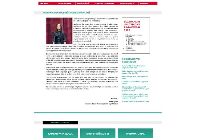 Heydər Əliyev Fondunun vitse-prezidenti Leyla Əliyevanın təşəbbüsü ilə Xocalı soyqırımı həqiqətlərinin dünya ictimaiyyətinə çatdırılması məqsədilə 2008-ci ildə təsis edilən “Xocalıya Ədalət” Beynəlxalq Kampaniyasının yeni internet səhifəsi istifadəyə verilib.